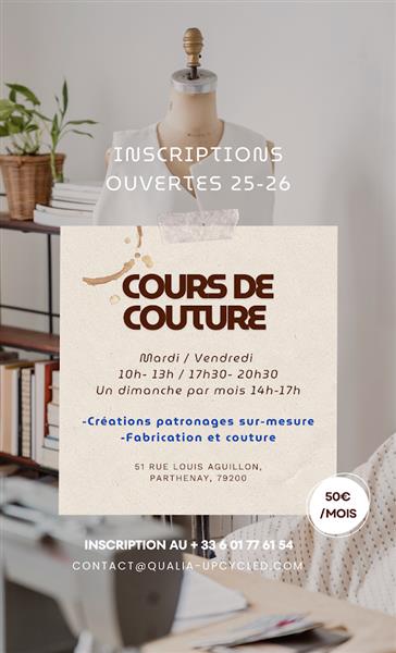 Horaires adaptés selon la proposition d'atelier Cours de couture les mardis et vendredis de 10h à 13h et de 17h30 à 20h30 et un dimanche par mois de 14h à 17h.